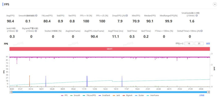 根据我们用 Perfdog 测出来的数据,王者荣耀在极致画质和超高帧率下战斗 30 分钟,它的帧率可以稳定在 90 帧左右(目前该机型最高只适配到90帧),波动非常小。